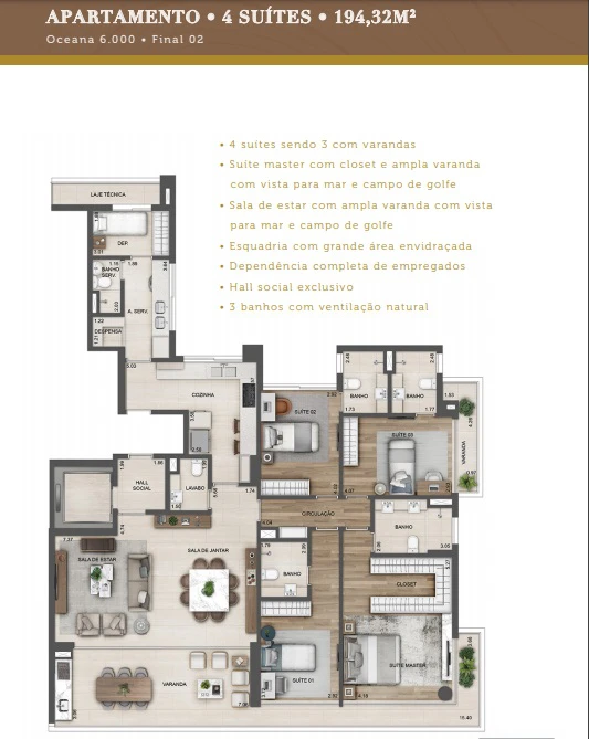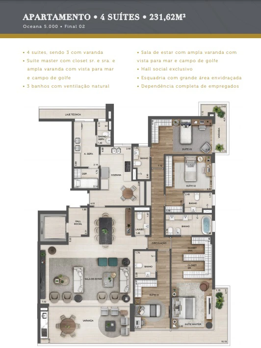 Oceana Golf apartamentos amplos, possuem plantas modernas com