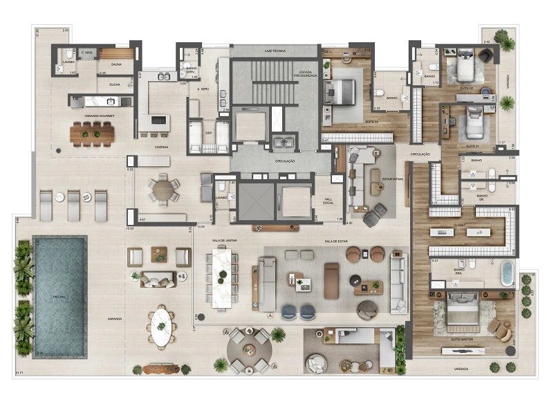 Piscina coberta climatizada c/ raia, Deck e prainha, Solarium, Academia,